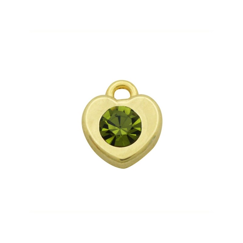 Colgante corazón con asa en zamak con baño de oro y cristal en color Olivine. Le recomendamos pegar ambas piezas con nuestro pegamento especial para joyería con referencia 7405.