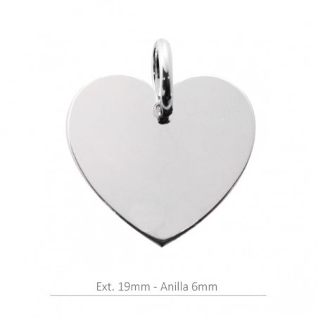 Colgante chapa en forma de corazón para grabar en plata de ley 925, fabricada en España. Viene con una anilla soldada también plata de ley 925. Es el tamaño grande de chapas para grabar que hay disponible.
