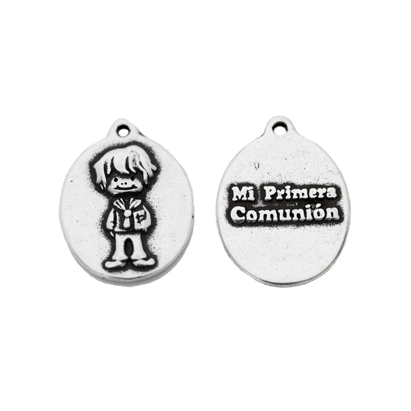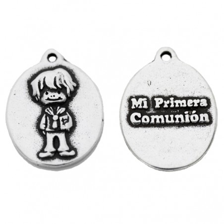 - Colgante medalla comunión niño en zamak baño plata. - Tamaño: 25x18mm agujero de 2mm. - El precio es por unidad.