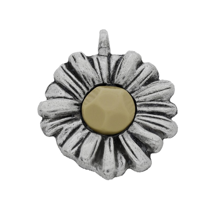 Colgante margarita con asa en zamak con baño de plata y resina en color marfil. Le recomendamos pegar ambas piezas con nuestro pegamento especial para joyería con referencia 7405.