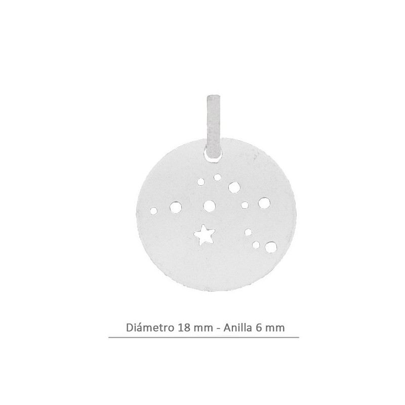 Colgante constelación horóscopo Acuario redondo en plata de ley 925. Fabricado en España.