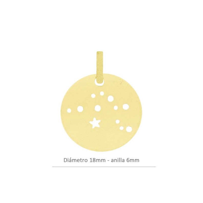 Colgante constelación horóscopo Acuario redondo en plata de ley 925 bañada en oro de 18k. Fabricado en España.