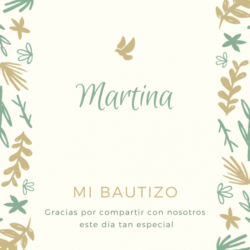 Tarjeta cuadrada de cartón con diseño de cpaloma en tonos dorados con verde jade con texto mi bautizo, especial para envolver tus detalles. Podrás hacerle dos cortes arriba y colgarle el colgante. También dos agujeros en medio y poner los pendientes y por ultimo dos cortes en en cada lateral de la tarjeta para las pulsera.