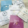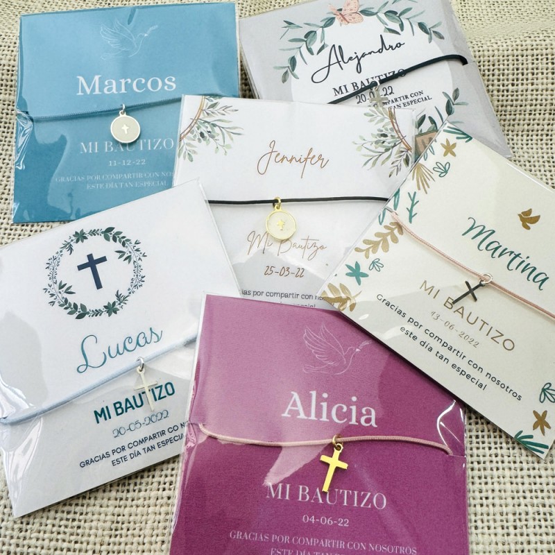 Tarjeta cuadrada de cartón con diseño de flores con texto mi bautizo, especial para envolver tus detalles. Podrás hacerle dos cortes arriba y colgarle el colgante. También dos agujeros en medio y poner los pendientes y por ultimo dos cortes en en cada lateral de la tarjeta para las pulsera.