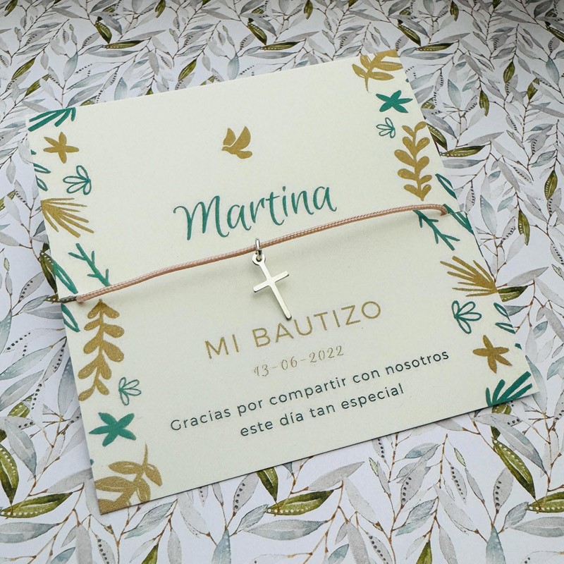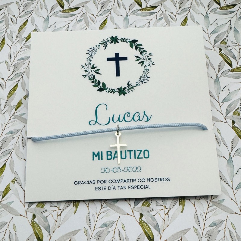 Sorprende a tus invitados creando a mano los detalles de tu fiesta de bautizo o comunión, regalándoles esta preciosa pulsera con colgante de cruz que podrá llevar todos los días para recordar ese bonito día. El color que tiene en la foto es el azul bebe y el rosa claro.