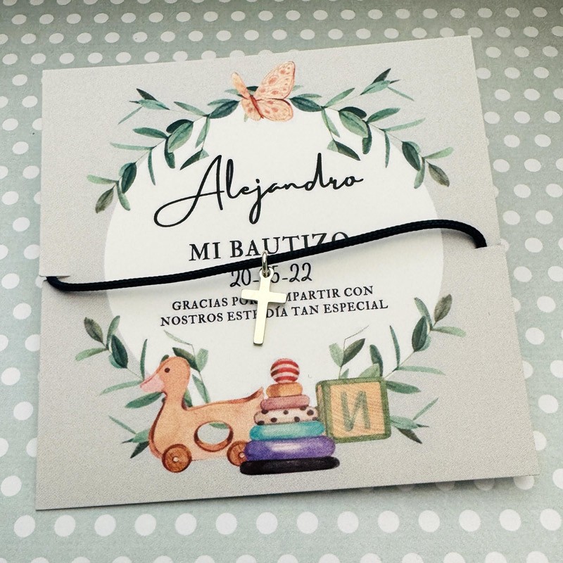 Sorprende a tus invitados creando a mano los detalles de tu fiesta de bautizo o comunión, regalándoles esta preciosa pulsera con colgante de cruz en plata de ley 925 que podrá llevar todos los días para recordar ese bonito día. El color que tiene en la foto es el azul marino.