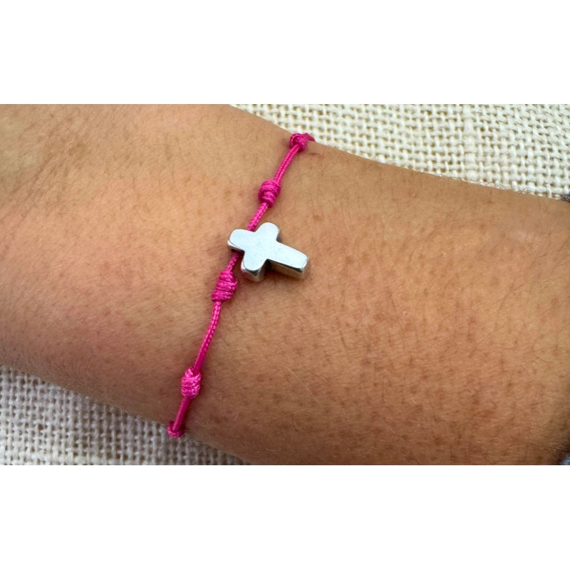 Sorprende a tus invitados creando a mano los detalles de tu fiesta de bautizo o comunión, regalándoles esta preciosa pulsera con colgante cruz que podrá llevar todos los días para recordar ese bonito día. El color que tiene el cordón en la foto es rosa.
