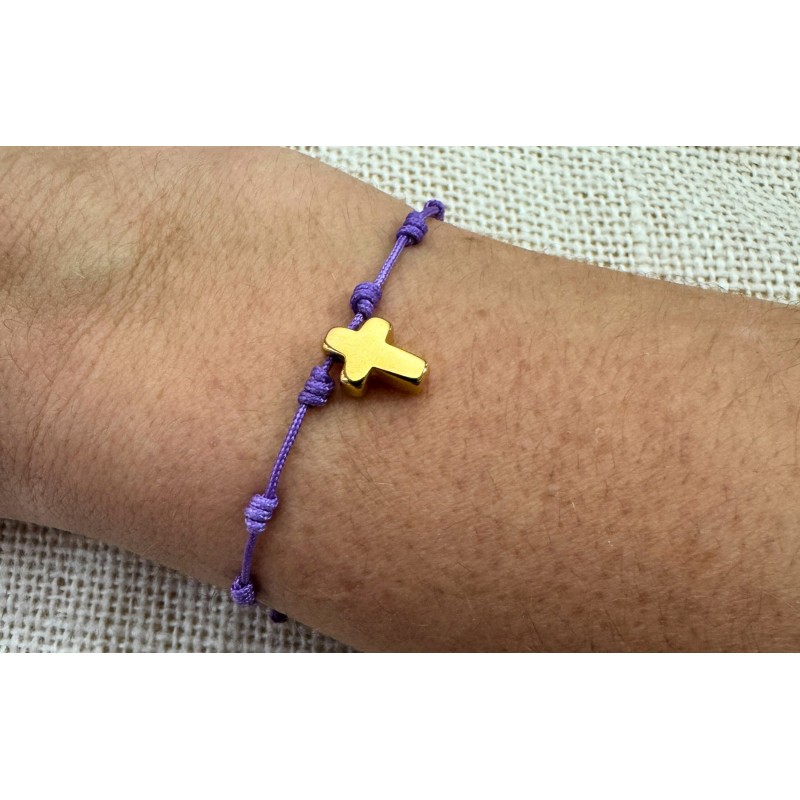 Sorprende a tus invitados creando a mano los detalles de tu fiesta de bautizo o comunión, regalándoles esta preciosa pulsera con colgante cruz que podrá llevar todos los días para recordar ese bonito día. El color que tiene el cordón en la foto es lila.