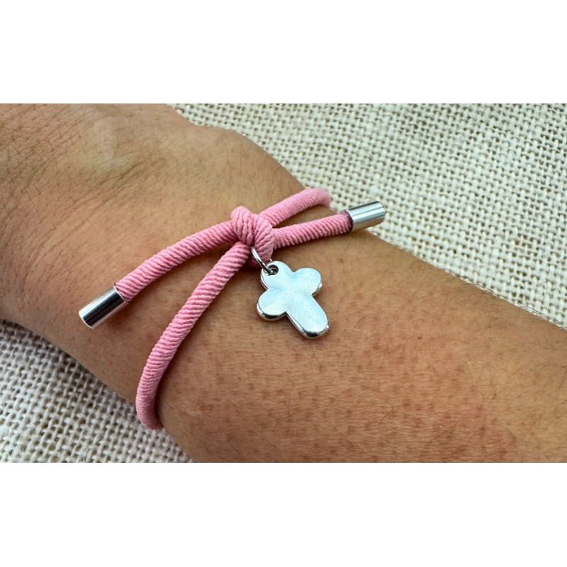 Sorprende a tus invitados creando a mano los detalles de tu fiesta de bautizo o comunión, regalándoles esta preciosa pulsera con colgante cruz que podrá llevar todos los días para recordar ese bonito día. El color que tiene el cordón en la foto es rosa clarito.