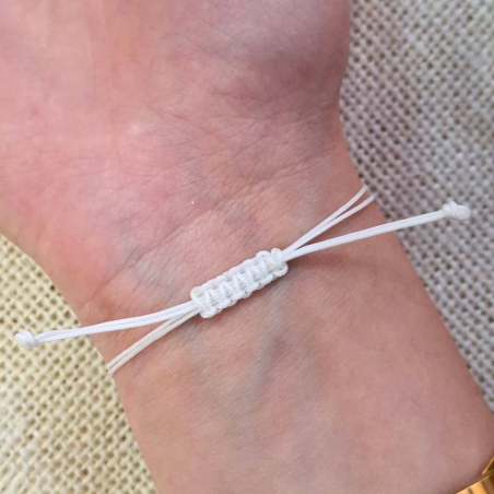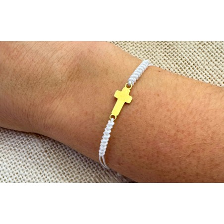 Sorprende a tus invitados creando a mano los detalles de tu fiesta de bautizo o comunión, regalándoles esta preciosa pulsera con entrepieza cruz que podrá llevar todos los días para recordar ese bonito día. El color que tiene el cordón en la foto es blanco.