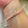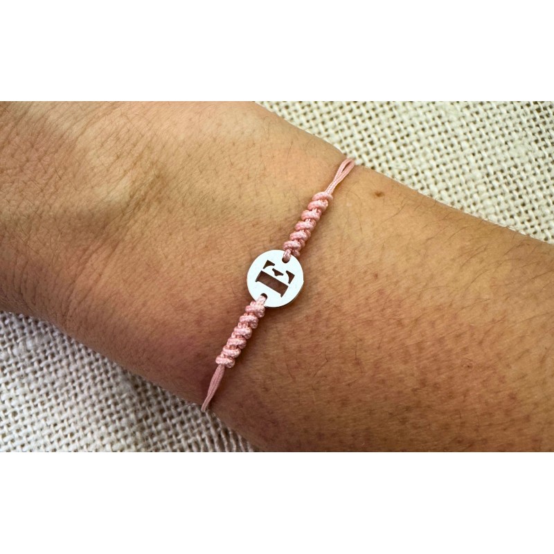 Sorprende a tus invitados creando a mano los detalles de tu fiesta de bautizo o comunión, regalándoles esta preciosa pulsera con entrepieza inicial que podrá llevar todos los días para recordar ese bonito día. El color que tiene el cordón en la foto es rosa claro.