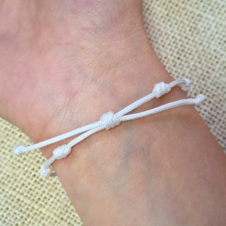 4. Para el cierre cruzamos los cordones y hacemos nudo de macramé con los 25 cm restantes.