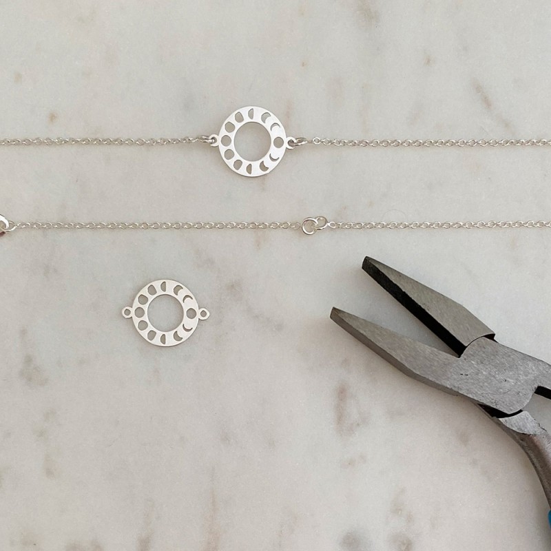 Entrepieza etapas lunares con dos asas en plata de ley 925. Fabricada en España.