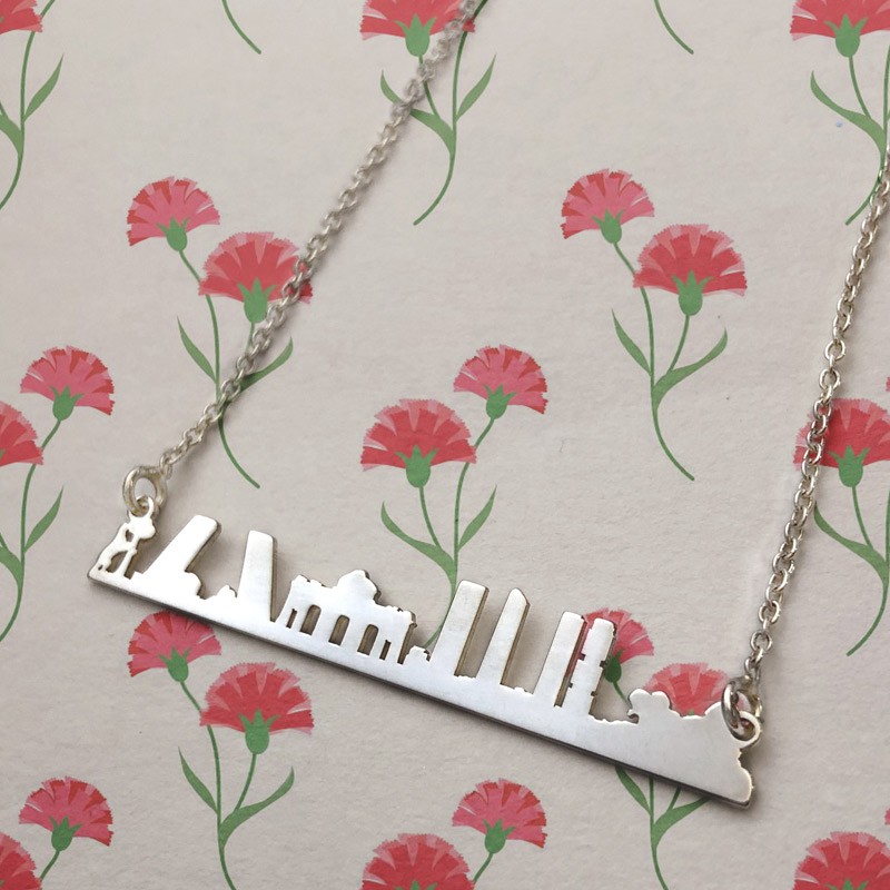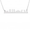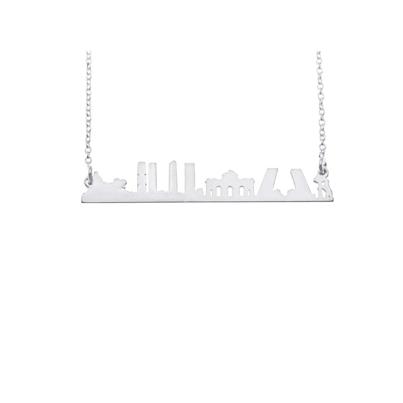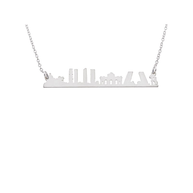 Entrepieza Skyline de Madrid con dos asas en plata de ley 925 fabricado en España. En ella se encuentran algunos de los elementos más emblemáticos de Madrid, como el Oso y el Madroño, las Torres Kio o la Puerta de Alcalá.