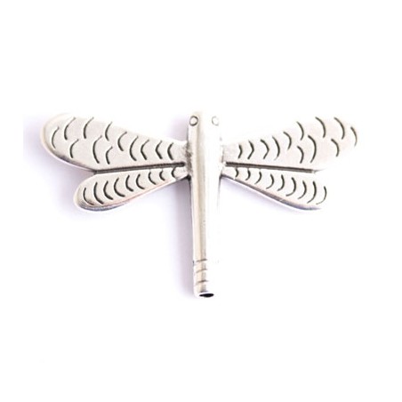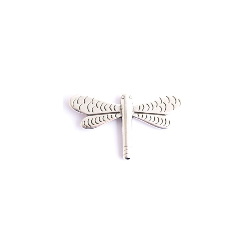 Entrepieza libélula en zamak con baño de plata. La bolsa contiene 1 unidad. El tamaño es de 24X43 mm. y tiene un taladro interior de 2 mm.