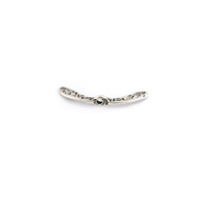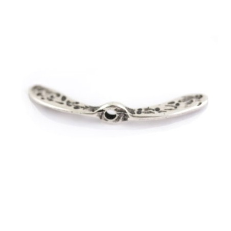 Entrepieza alas con taladro central en zamak con baño de plata. La bolsa contiene 1 unidad. El tamaño es de 50 x 12 mm. y tiene un taladro de 3 mm.
