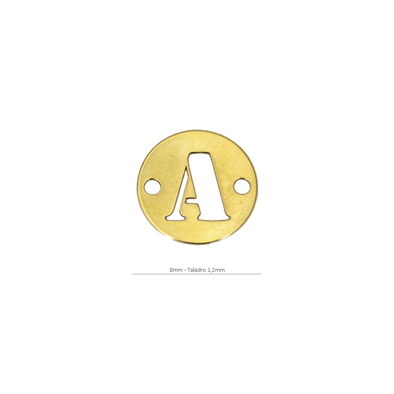 Entrepieza redonda con dos taladros letra A en plata de ley 925 con baño oro 18k. Fabricada en España.