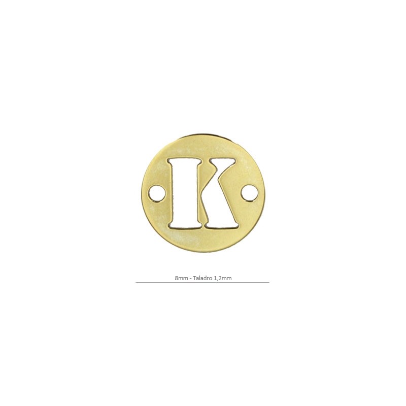 Entrepieza redonda con dos taladros letra K en plata de ley 925 con baño oro 18k. Fabricada en España.