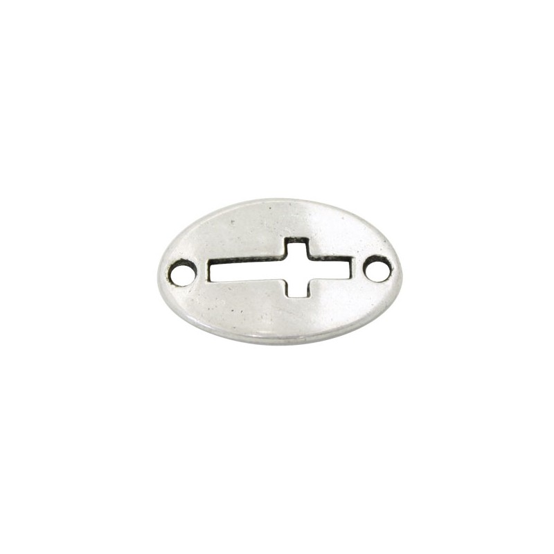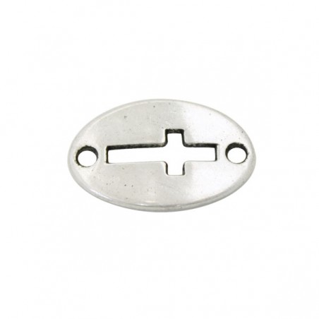- Entrepieza cruz en zamak con baño de plata. - El tamaño es de 20 milímetros y tiene dos taladros de 2 milímetros. - El precio es por bolsa y la bolsa contiene 1 unidad.