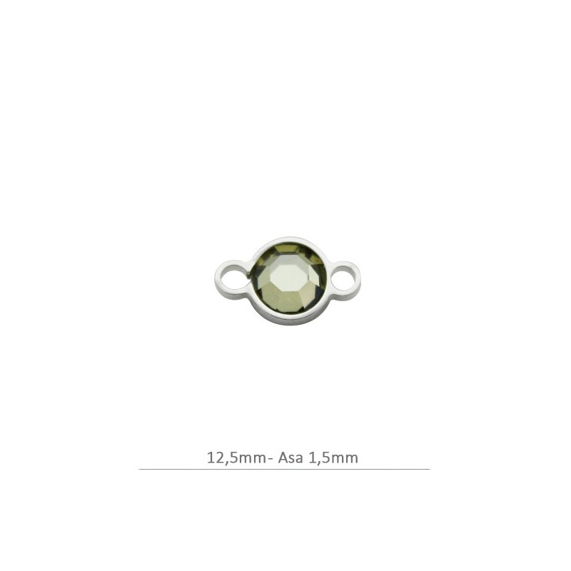 Entrepieza redonda con cristal Swarovski en color Olivine de 12,5x7,5 mm con dos asas en plata de ley 925. Fabricada en España.