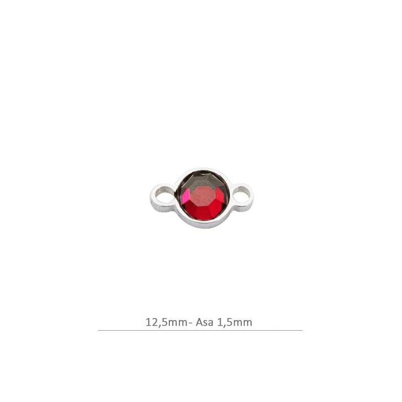 Entrepieza redonda con cristal Swarovski en color Rubí de 12,5x7,5 mm con dos asas en plata de ley 925. Fabricada en España.