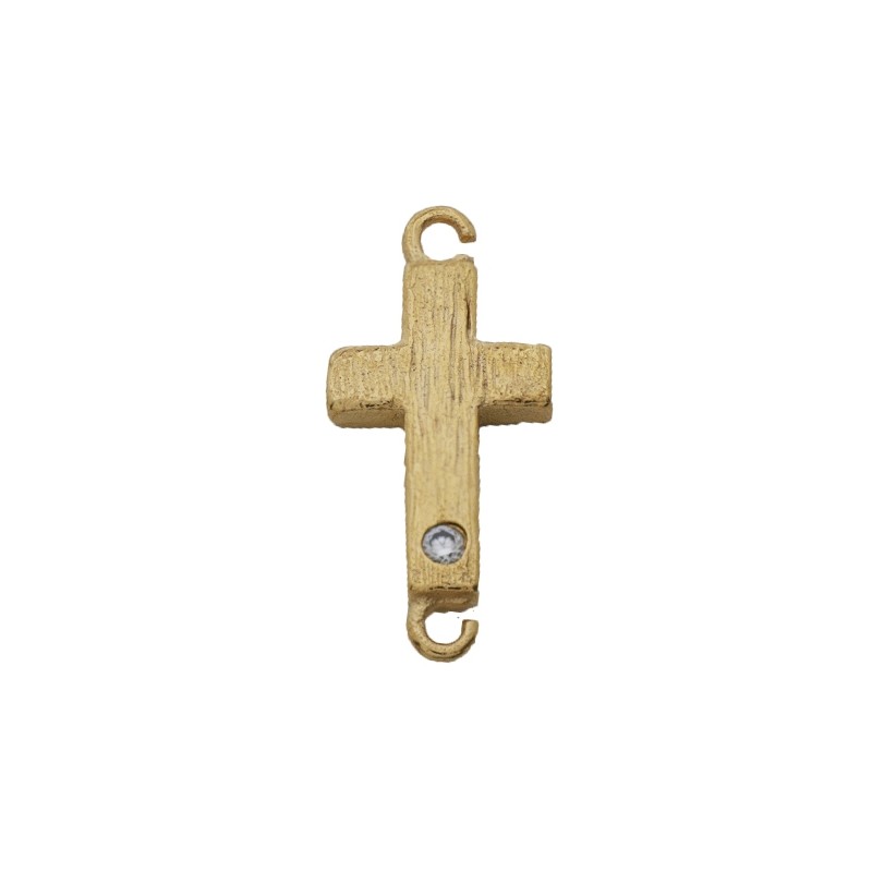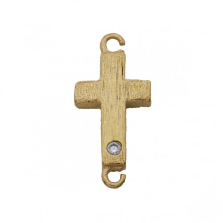 Entrepieza cruz en zamak con baño de oro. La bolsa contiene 1 unidad. El tamaño es de 15x7mm y tiene dos asas de 1mm.