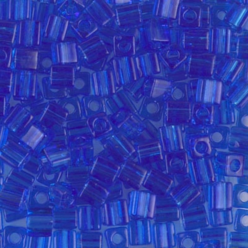 Cubos de la marca Miyuki de 4 mm en color Transparent Sapphire. Los cubos son uniformes y tienen un agujero pasado de 1,6 mm.