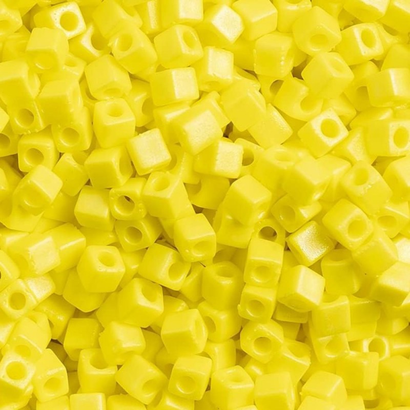 Cubos de la marca Miyuki de 3 mm en color Opaque Yellow. Los cubos son uniformes y tienen un agujero pasado de 1,5 mm.