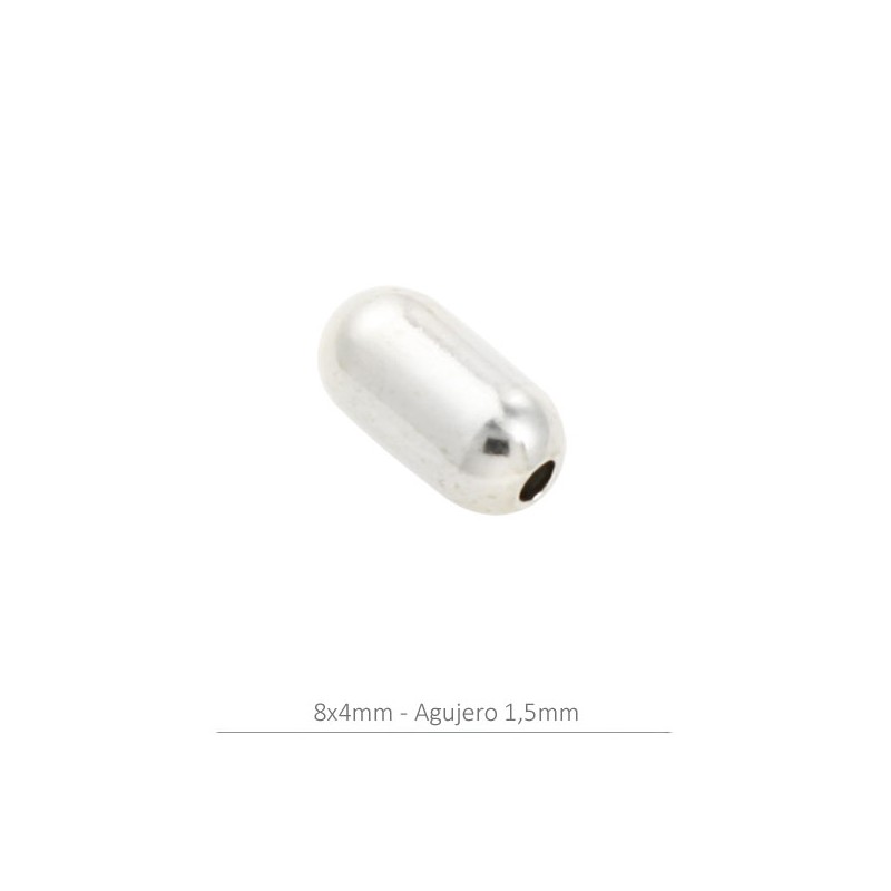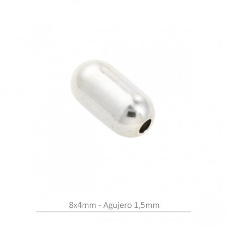 Entrepieza lisa con forma de cápsula de tamaño mediano, en plata de ley. La bolsa contiene 2 unidades. El tamaño es de 4x7,8 mm. y el taladro de 1,6 mm.