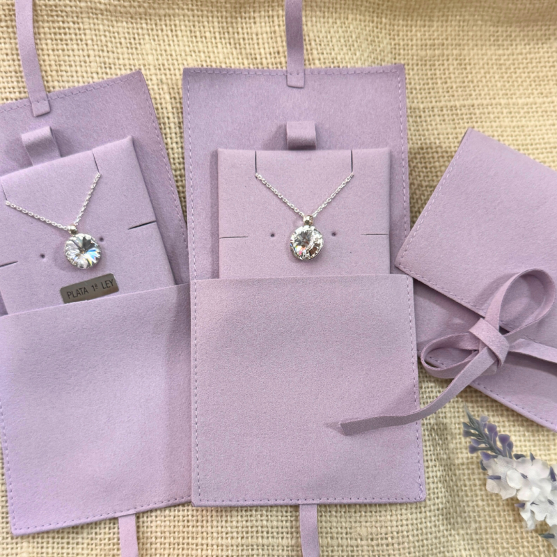 Un poquito más abajo, en productos relacionados, podéis encontrar una tarjeta del mismo color y material que podéis introducir dentro de la bolsita para colocar y presentar vuestras joyitas.