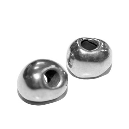 Bola golpeada en zamak con baño de plata. La bolsa contiene 20 unidades. El tamaño es de 7x8 mm. y el taladro es de 3 mm.
