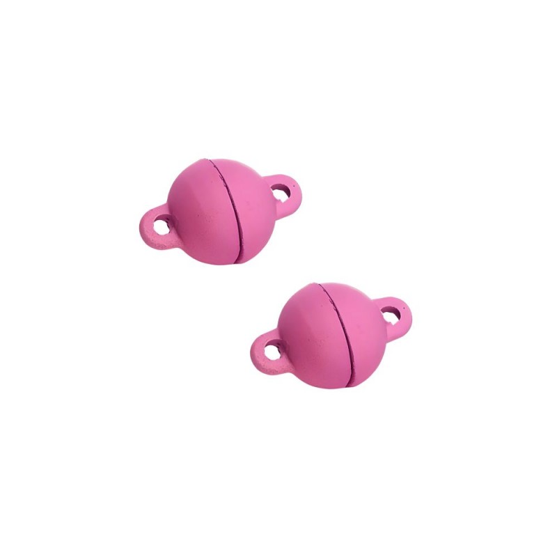 Cierre de imán redondo de cobre lacado en fucsia de 8mm de diámetro. Para su montaje, recomendamos utilizar hilo de 0,8mm.