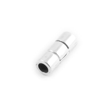Cierre cilíndrico con imán en zamak con baño de plata. La bolsa contiene 1 unidad. El tamaño es de 21x8 mm. y tiene un taladro de 5 mm.
