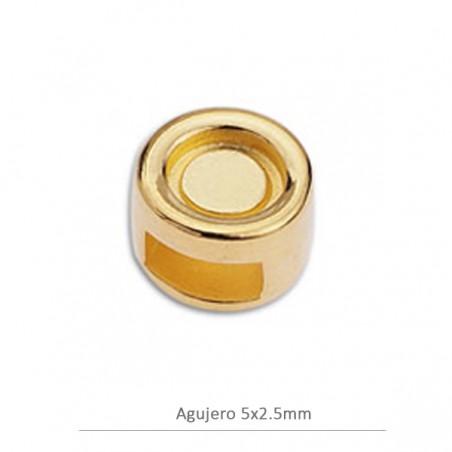 Entrepieza en zamak con baño de oro. El tamaño es de 5x2,5 milímetros. El precio es por bolsa de 6 unidades.
