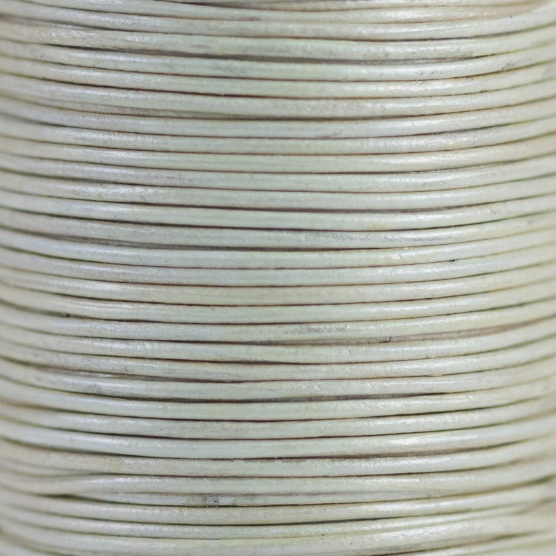 - Cuero redondo de 1 mm de grosor en color blanco perlado. Este cuero es muy suave y flexible siendo ideal para hacer nudos o bien para llevar pulseras y colgantes muy finos.