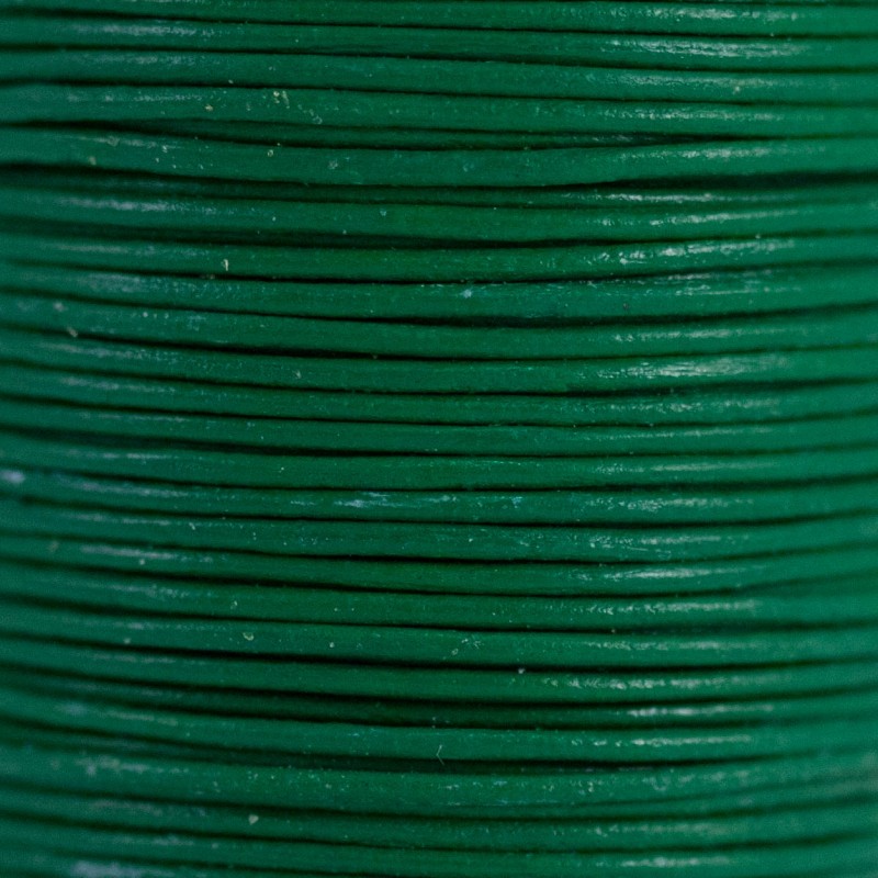 - Cuero redondo de 1 mm de grosor en color verde hierba. Este cuero es muy suave y flexible siendo ideal para hacer nudos o bien para llevar pulseras y colgantes muy finos.