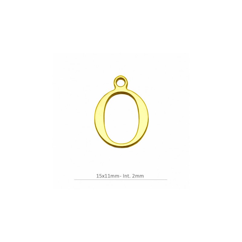Colgante letra O con anilla, en plata de ley con baño de oro. La bolsa contiene 1 unidad. El tamaño es de 15x12 mm. y la anilla es de 2 mm.