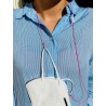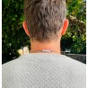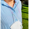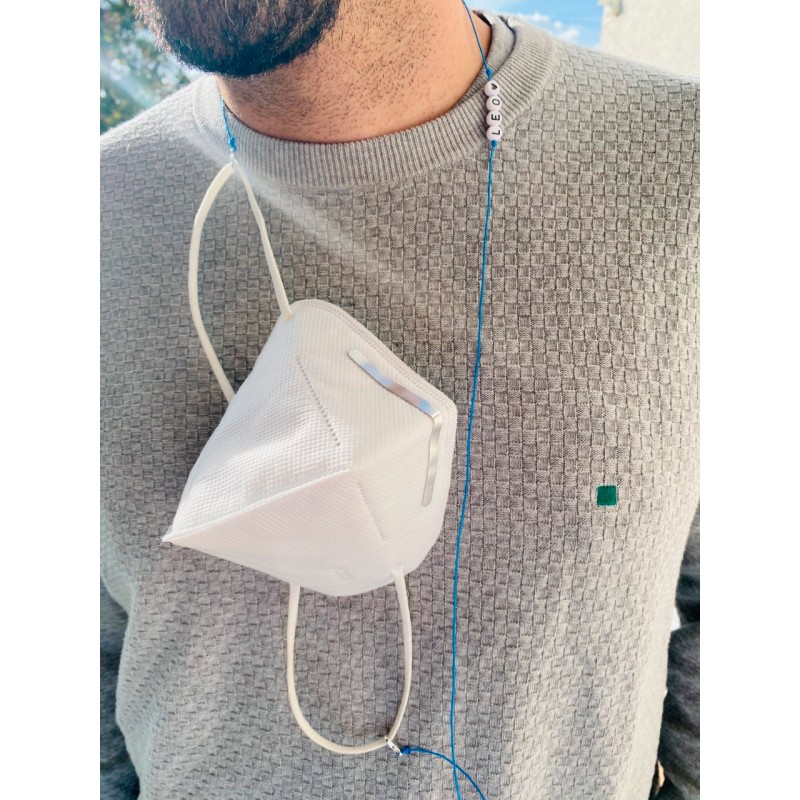 2. Pasamos el cordón por el agujero de cada mosquetón. Y hacemos nudo corredizo. En este momento ajustamos el largo deseado del cuelga mascarillas.