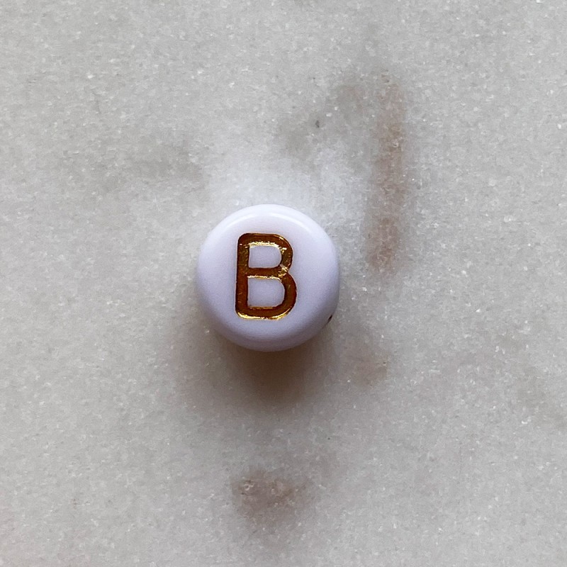 Cuenta de color dorado letra B. Diámetro 8mm. Taladro 1mm