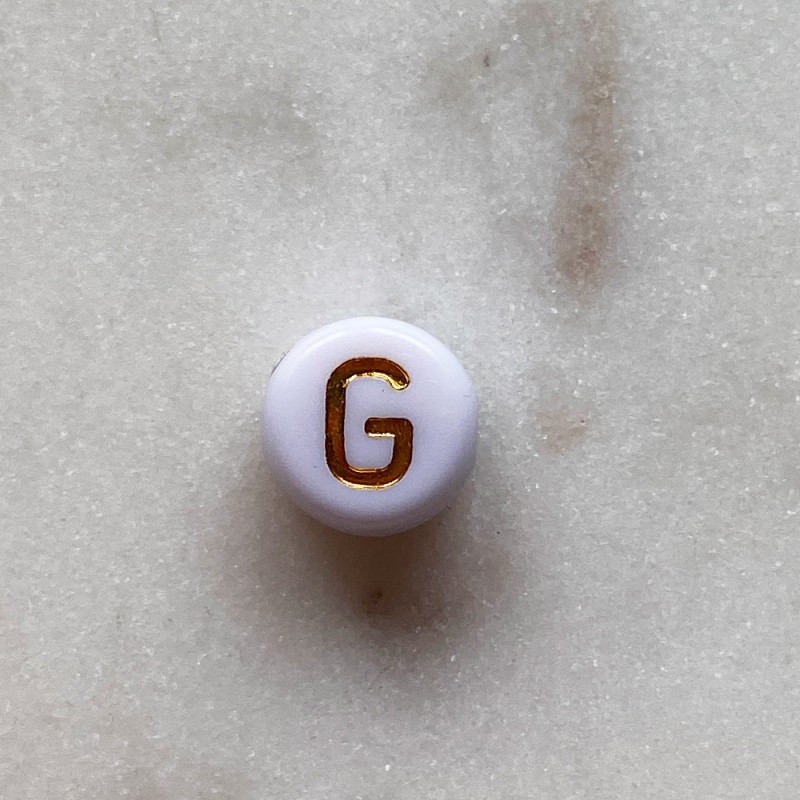 Cuenta de color dorado letra G. Diámetro 8mm. Taladro 1mm