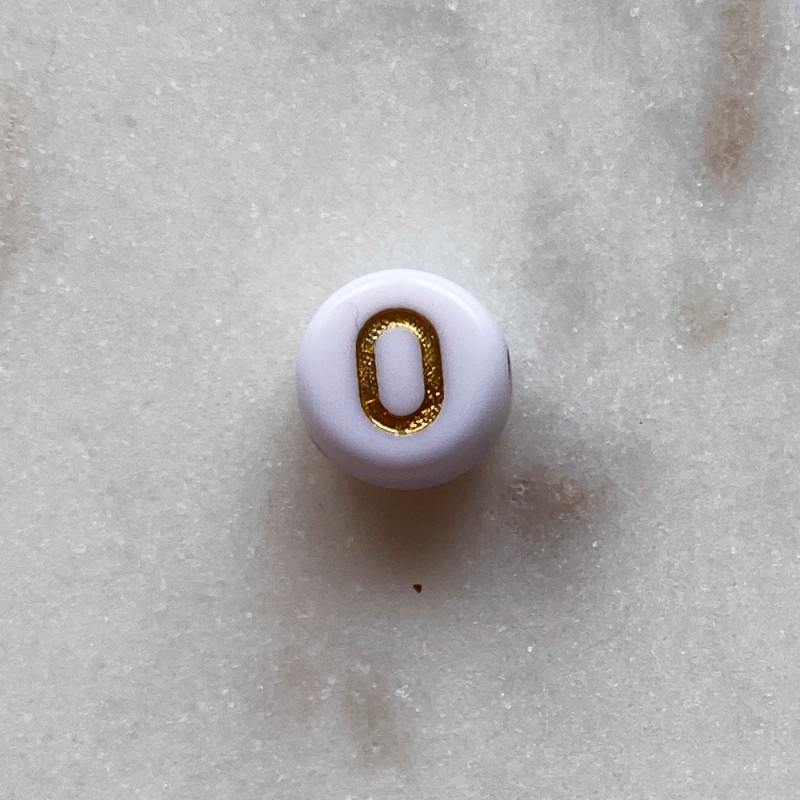 Cuenta de color dorado letra O. Diámetro 8mm. Taladro 1mm