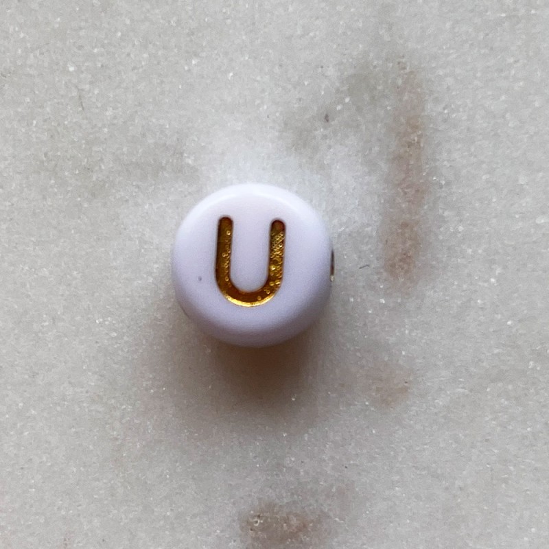 Cuenta de color dorado letra U. Diámetro 8mm. Taladro 1mm