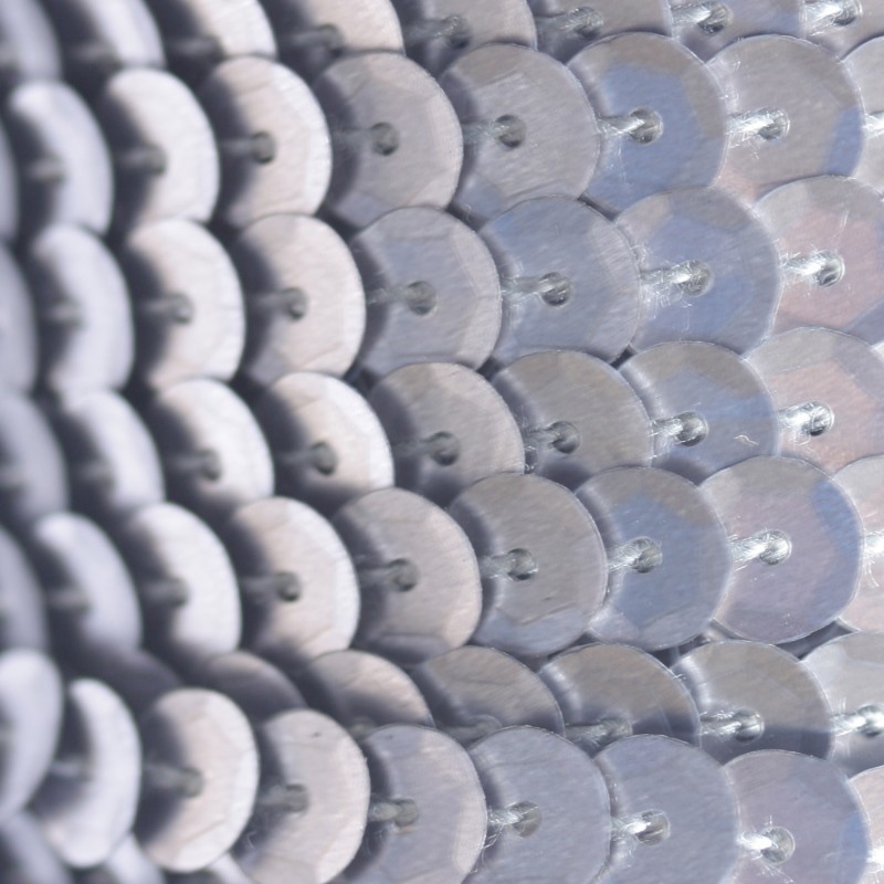 Lentejuela cóncava en color plata de 6mm. Se vende por metro.