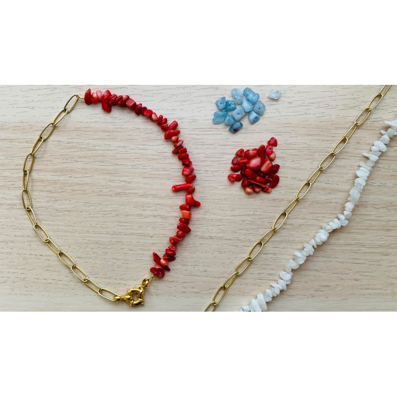 Diviértete creando tus propias joyas y crea tu propia gargantilla con chips en ágata o coral rojo y cadena ovalada larga en plata de ley 925 o bañada en oro de 18k. Queda ideal.