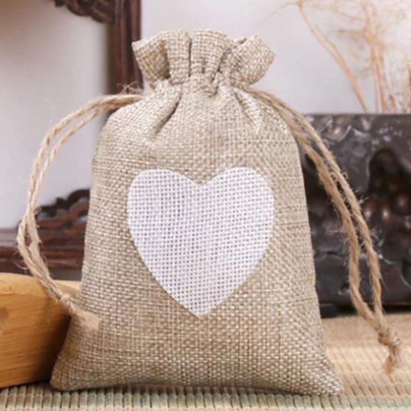 Saco de yute beige con estampado corazón en blanco con cinta ajustable.