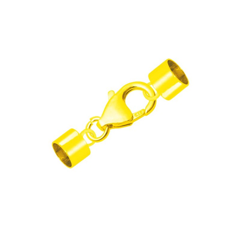 Cierre montado de tubo cerrado con mosquetón para cordón de 6 mm. El tubo es de 9 mm de largo y 6 mm de interior en plata de ley 925 con baño oro de 18k. Fabricado en España.