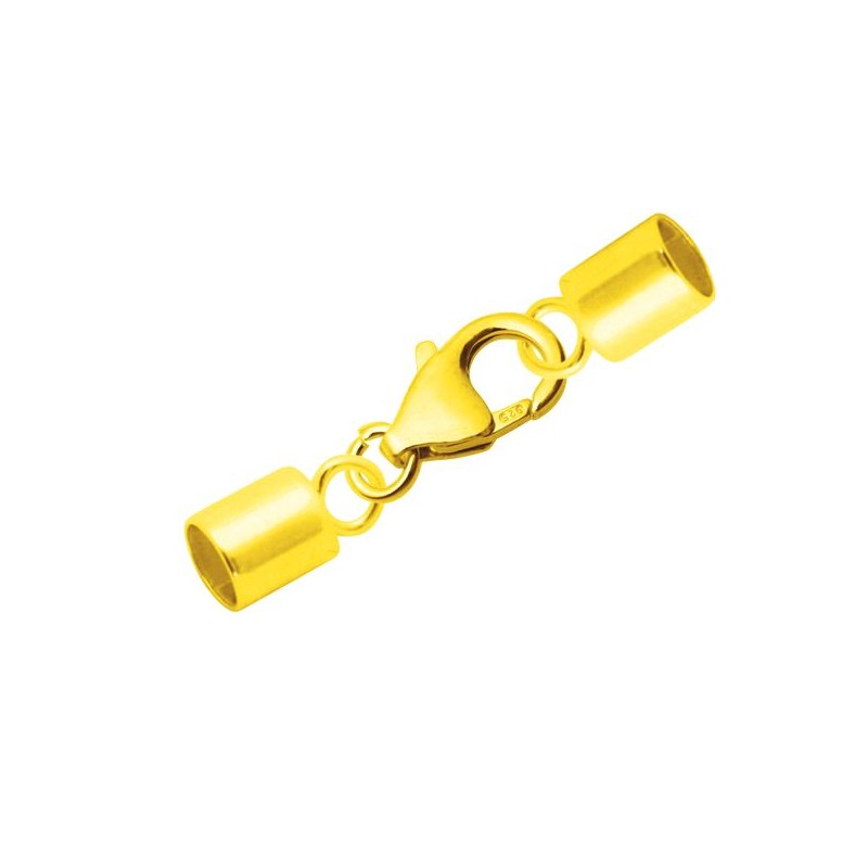 Terminal montado tubo cerrado con mosquetón para cordón de 4 mm. El tubo es de 5,3 mm de largo y 4,1 mm de interior en plata de ley 925 con baño oro de 18k. Fabricado en España.