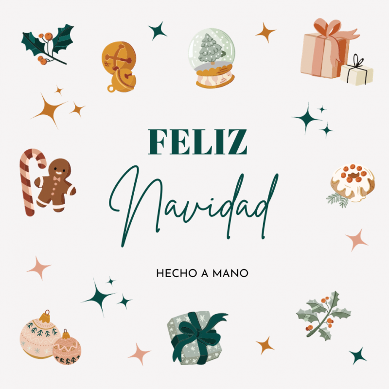 Tarjeta cuadrada de cartón con diseño de navidad con iconos y frase de hecho a mano, especial para envolver tus detalles + bolsa transparente. Podrás hacerle dos cortes arriba y colgarle el colgante. También dos agujeros en medio y poner los pendientes y por ultimo dos cortes en en cada lateral de la tarjeta para las pulsera.
