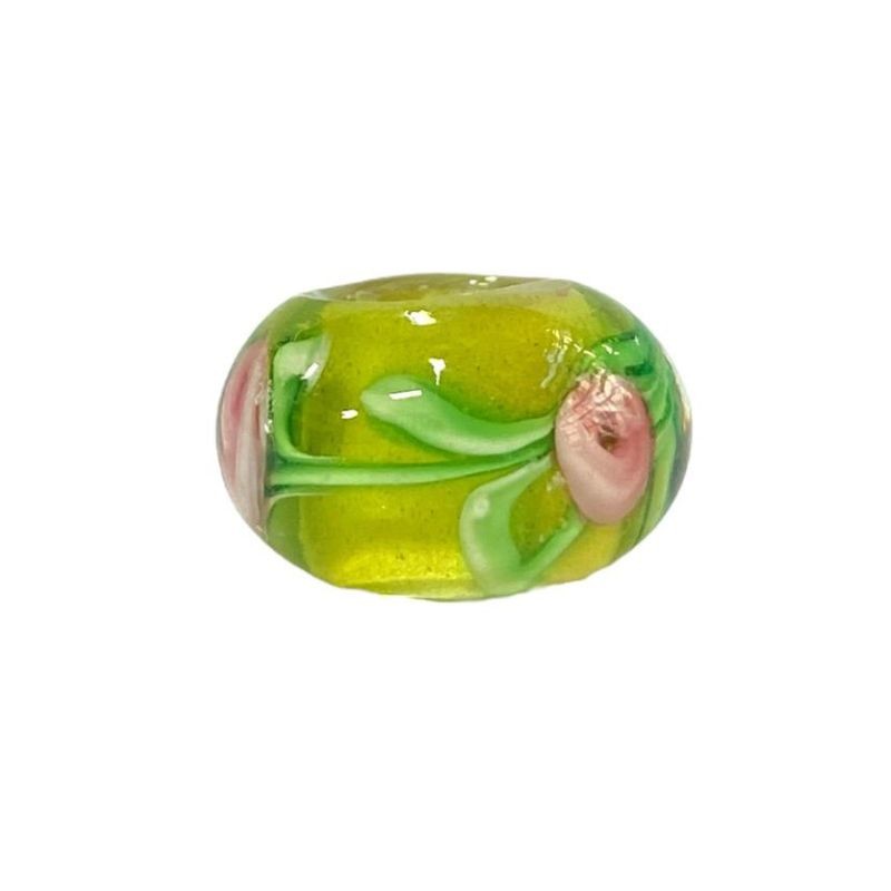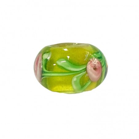 Cuenta cristal murano 14 x 8 mm para cordón 5 mm. Pistacho con flores rosas
