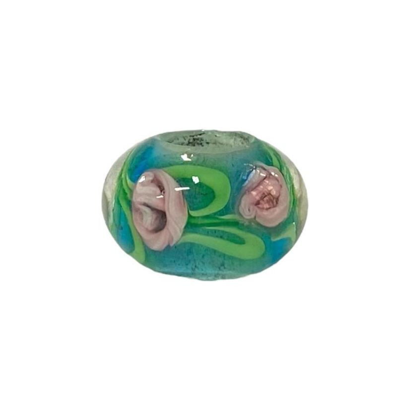 Cuenta cristal murano 14 x 8 mm para cordón 5 mm. Azul con flores rosas